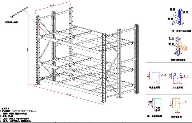 圖紙中是三立柱重型貨架一般承重在2至3噸以上才會做三立柱貨架優勢:更加有效的利用空間、降低儲存成本,三立柱貨架適用于深度大、長度長的規格貨架。