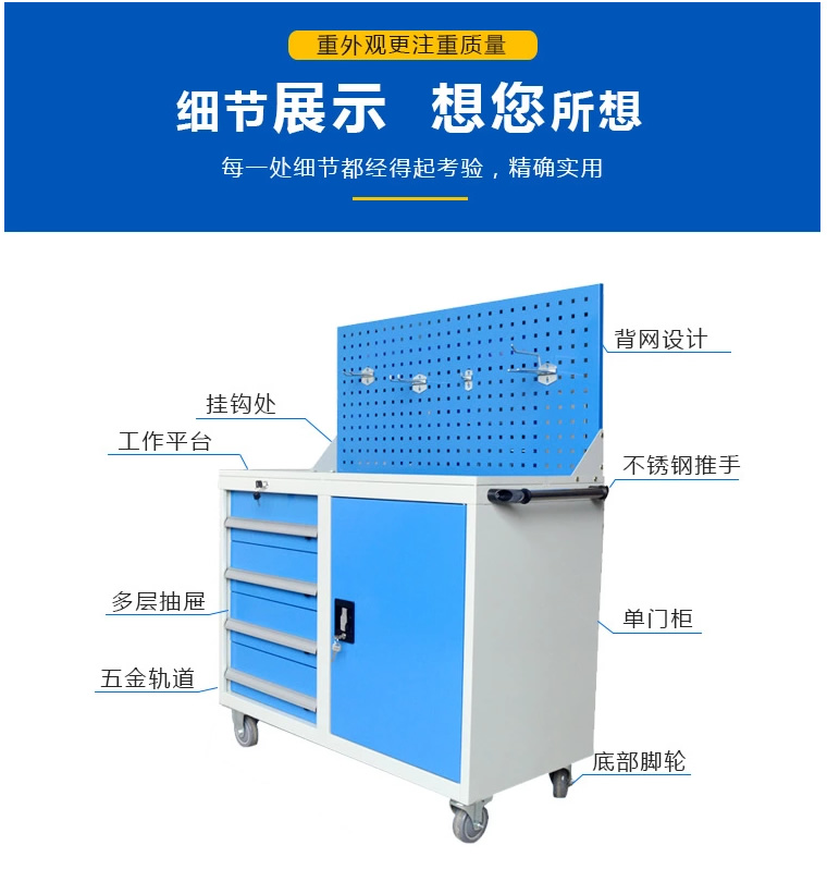 1.高強度的結構設計和特殊的噴粉表面處理工藝,能適應工廠較復雜的工作環境。2.裝有優質軸承的導軌,保證單個抽屜承受額定載荷時亦能輕松順暢開合。3.抽屜內自由調節的隔板,能使您隨意分隔儲物空間。工具柜工具柜4.全寬型鋁合金抽屜把手及可換的標簽,美觀,方便,實用。5.先進的抽屜安全扣設計,保證抽屜在關閉后不會意外滑出。